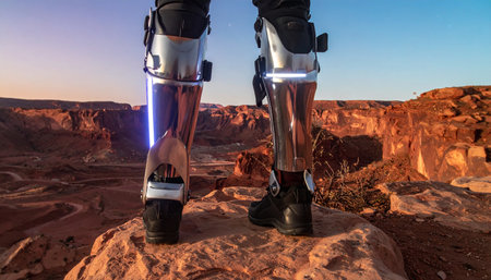 A person equipped with advanced bionic leg technology stands powerfully on a rocky outcrop, gazing across a vast desert canyon at dawn. This image symbolizes the future of human mobility, perseverance, and the boundless spirit of adventure, where innovation overcomes physical challenges.
