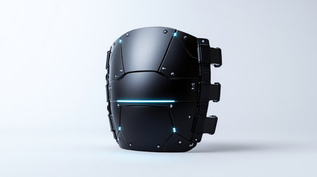 A sleek, black, futuristic sci-fi device featuring a prominent glowing blue light, presented against a clean white background, evoking advanced technology and innovation.