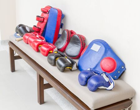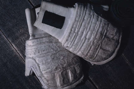 Close up of boxing equipment: fighting gloves and hand bandage . Ready to fight concept.