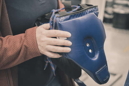 Woman in store chooses to buy blue helmet to protect your head during boxing. Concept of women independence, feminism, gender equality and martial arts. Hands close up shot