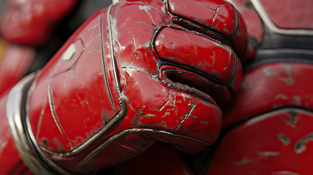 This image features a close-up view of a worn red gauntlet, showcasing intricate textures and scratches that highlight its battle-worn history and craftsmanship.