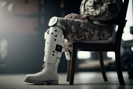 A man in military uniform with a prosthetic leg sits on a chair, modern bionic prosthesis, loss of a limb in war, veteran. Generative AI.