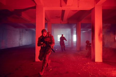 Modern warfare soldiers in dark with combat ammunition and weapons in the hands of equipped laser sights are in battle order. Mixed media.