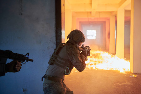 United States Army ranger during the military operation. Professional marine soldiers training with weapon on a military range.