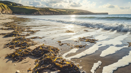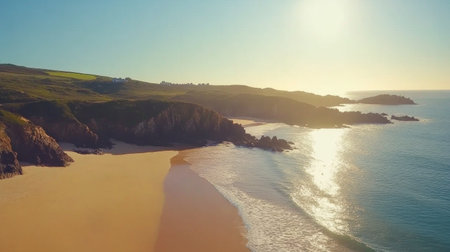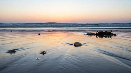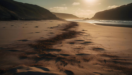 Peaceful sunset over a secluded beach. Golden light illuminates the sand.