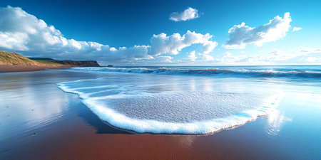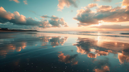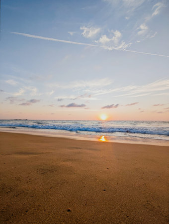Stunning sunset over a tranquil beach. Ocean waves gently lap the shore, reflecting the warm colors of the sky.