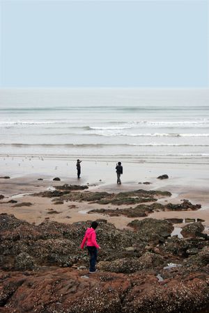 Woman Walking On The Sandy Beach In Distance In Rhossili Bay, Walesh Coast Path, Wales