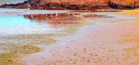 Beach rocks totally wet with water in the form of a puddle making reflections of the blue sky in a day of strong and bright sun.