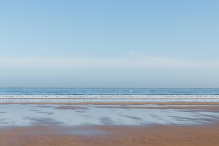 Portuguese Atlantic Ocean beach in the morning mist at sunrise. Breathtaking landscape and nature of the Portugal, popular travel destination in western Europe.