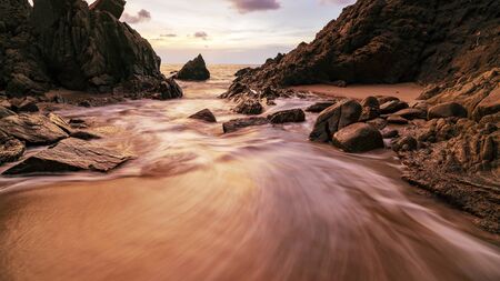 Long exposure image of Dramatic sky and wave seascape with rock in sunset scenery background.