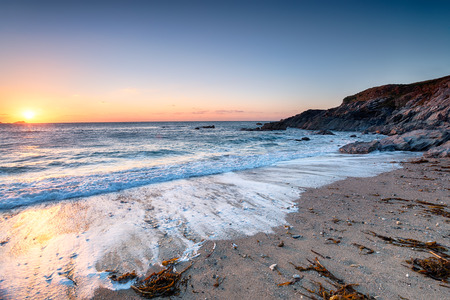 Absolutely stunning landscape images of Holywell Bay beach in Cornwall UK during golden hojur sunset in Spring