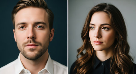 A split-screen image featuring a young man and woman with neutral expressions, dressed in formal attire, against contrasting dark and light backgrounds.