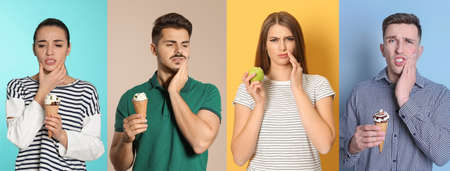 Collage with photos of people with sensitive teeth on different color backgrounds. banner design
