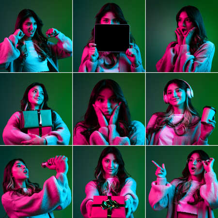 Collage, preset of young girls portraits with different emotions posing isolated on green studio backgroud in neon pink light.