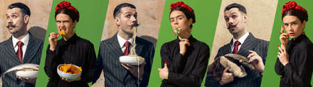 Composite image of portraits of young beautiful woman and stylish man in images of famous painters. Comparison of eras, beauty, human emotions, characters, art concept.