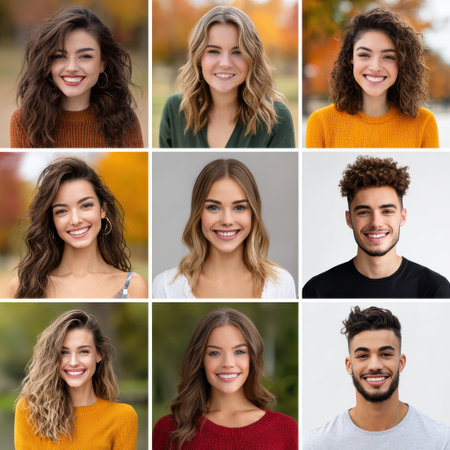 A vibrant collection of portraits featuring smiling young adults with various hairstyles, set against a beautiful autumn backdrop that radiates joy.