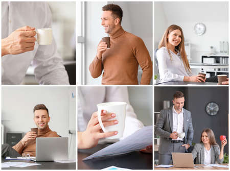 collage of smiling multicultural businesspeople talking during coffee break in office