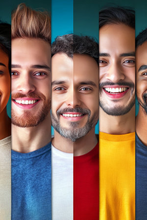 A collage presents a diverse group of individuals, all smiling with genuine expressions. The composition utilizes a split-screen effect, showcasing various people. The overall aesthetic suggests a bright and friendly atmosphere, possibly indicating collaboration or togetherness. Suitable for commercial projects.