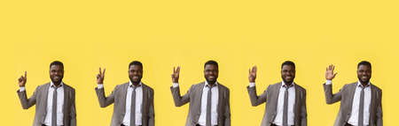 Young african mans portraits with different emotions on his face over colorful background in neon. Angry, annoyed, calm, happy, surprised. Collage