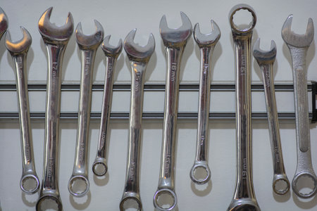 Wrench tool set, made of steel, hanging on wall in a workshop