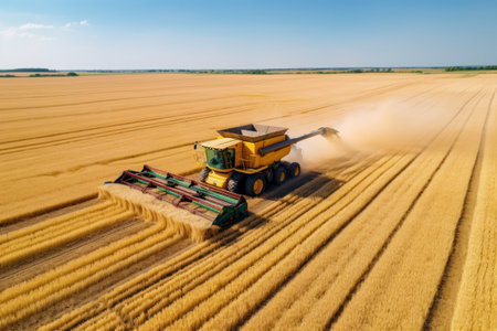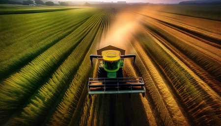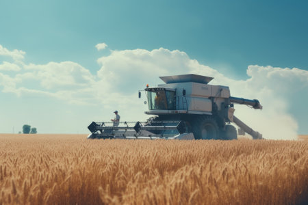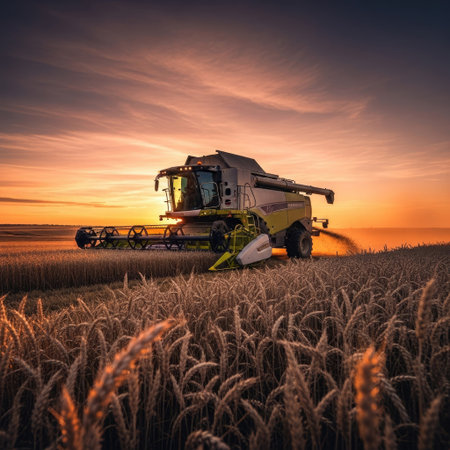 A combine harvester operates in a field of wheat under a dramatic sunset. The agricultural machine is central, showcasing its mechanics and function. Warm colors, including orange and gold, create a visually appealing scene. Ideal for illustrating farming, agriculture, or environmental themes in various media.