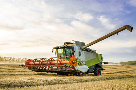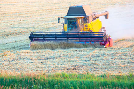 Combine harvester in action on rye field. Process of gathering a ripe crop on the sunset in late summer by agricultural machinery