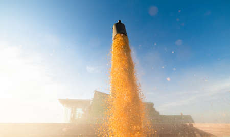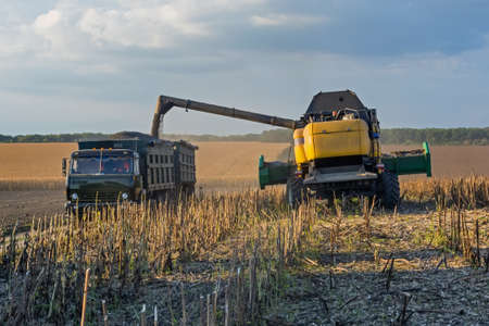 harvesting corn by a combine harvester, followed by unloading and transportation of grain. Work in the field in the rays of the sun in the early autumn.
