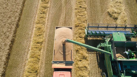 Aerial view of a combine unloads grain from grain compartment into a truck. One truck drove off and the next truck drove up to receive wheat grains.