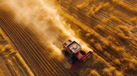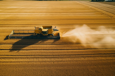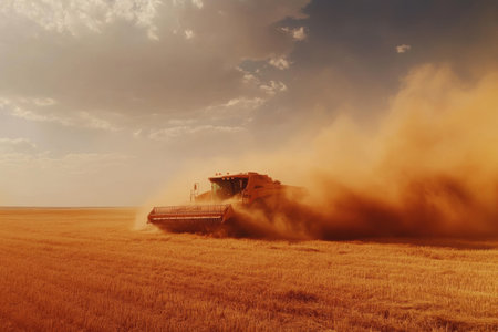 A powerful harvester works diligently in a golden wheat field, creating clouds of dust as it moves through the crop at sunset, illuminating the landscape.