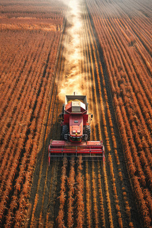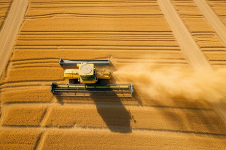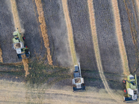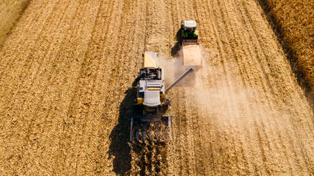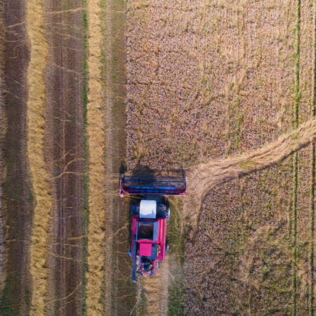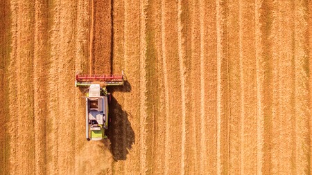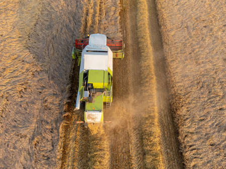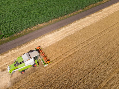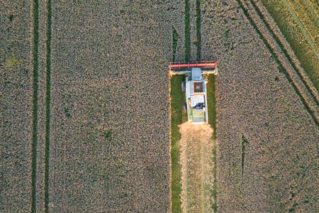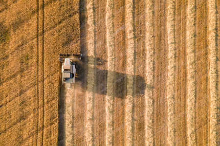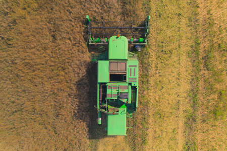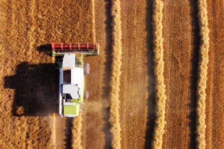 Top view of combined harvester working on field in sunny fall day. Agriculture concept.