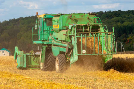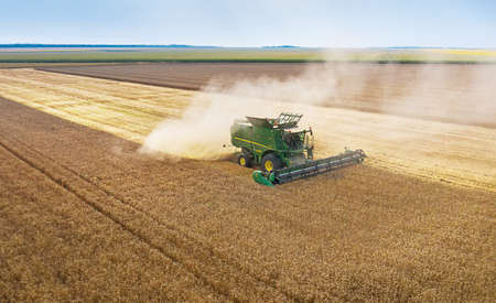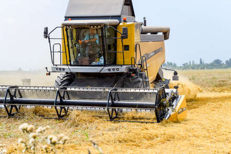 Kuchugury, Russia - July 16, 2017: Harvester machine to harvest wheat field working. Combine harvester agriculture machine harvesting golden ripe wheat field. Agriculture