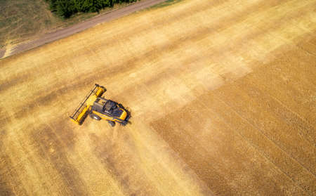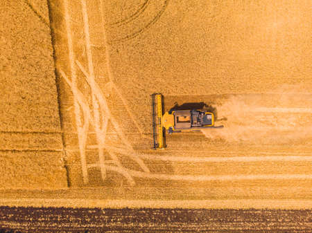 Aerial view of the combine harvester agriculture machine working on golden ripe wheat field.