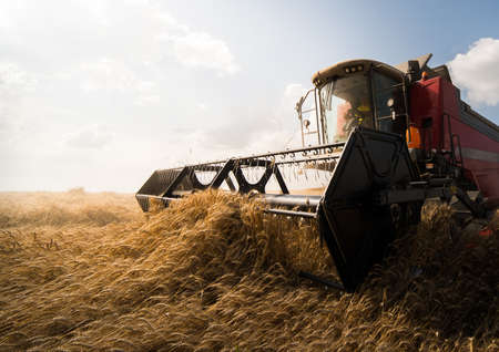 Combine harvester harvest rice wheat on a farm. Image of agriculture.