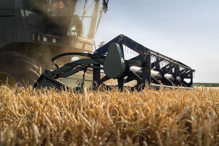 The harvester is harvesting wheat in the field. grain preparation. agronomy and agriculture.