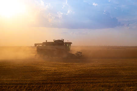 Harvester working in wheatfield at sunset. Harvest ripe wheat. Agriculture and farming