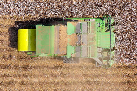 Santa Fe, Argentina, May 5, 2021: Harvester from a drone. Long exposure photography.