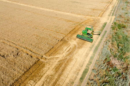 Combine harvester at work harvesting field wheat. Aerial view Combine harvester mows ripe spikelets, barley, rye. Combine harvester harvest ripe wheat on a farm.