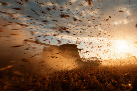 Combine Harvester in Action with Flying Wheat Chaff at Sunset