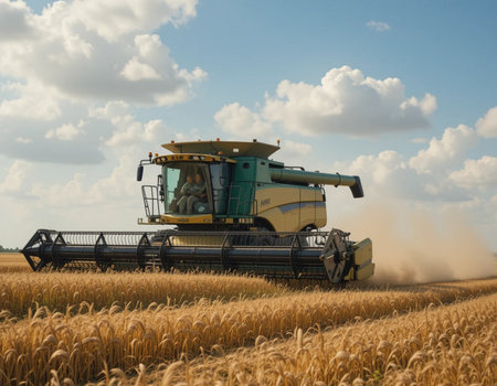 Weathered farmer operating combine harvester in a golden wheat field under harsh sun. Cinematic Dutc
