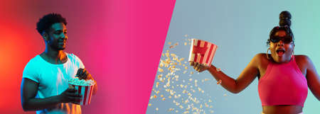 Collage of portraits of young african people, boy and girl with popcorn isolated over colored neon backgrounds.
