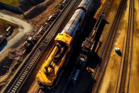 Overhead view of train yard with trains on the tracks and one on the ground. Generative AI.