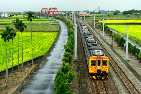 indian railway train on paddy fields. This image was capture at Goa on March 2016.
