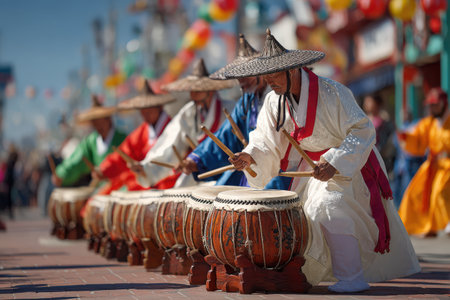 Group of male performers in traditional clothing playing drums at a festive outdoor celebration, highlighting cultural traditions and vibrant energy in the scene