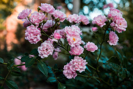 Bush with pink rose flowers on a background of emerald foliage, flowering,