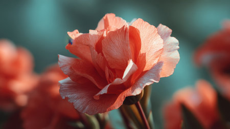 This close-up image showcases a stunning coral flower with intricate petals, beautifully illuminated by natural light, perfect for nature lovers and floral enthusiasts.