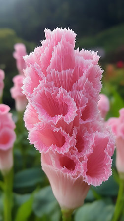 Detailed image showcasing a vibrant pink Siam Tulip (Curcuma alismatifolia) with fringed edges, nestled among other pink blooms against a blurred green garden backdrop.