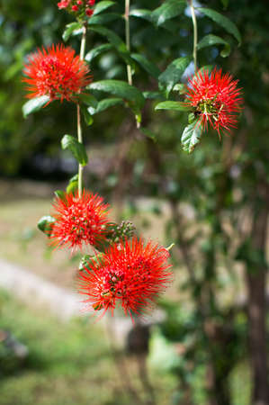Red flower Calliandra haematocephala flower blooming in greenhouse.