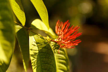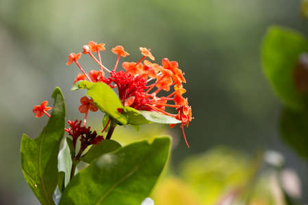 Red Ixora flower in the garden with blurred background, stock photo