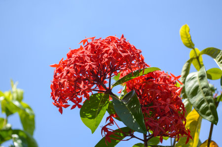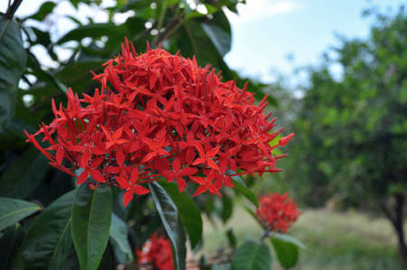 Ixora Chinensis flower blooming in garden and blue sky in background. Red spike flower or Rauvolfia Serpentine or West Indian Jusmine