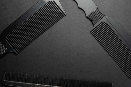 On a black surface are old barber tools. barber tools. three comb. black monochrome. frame. top view flate lay. copy space